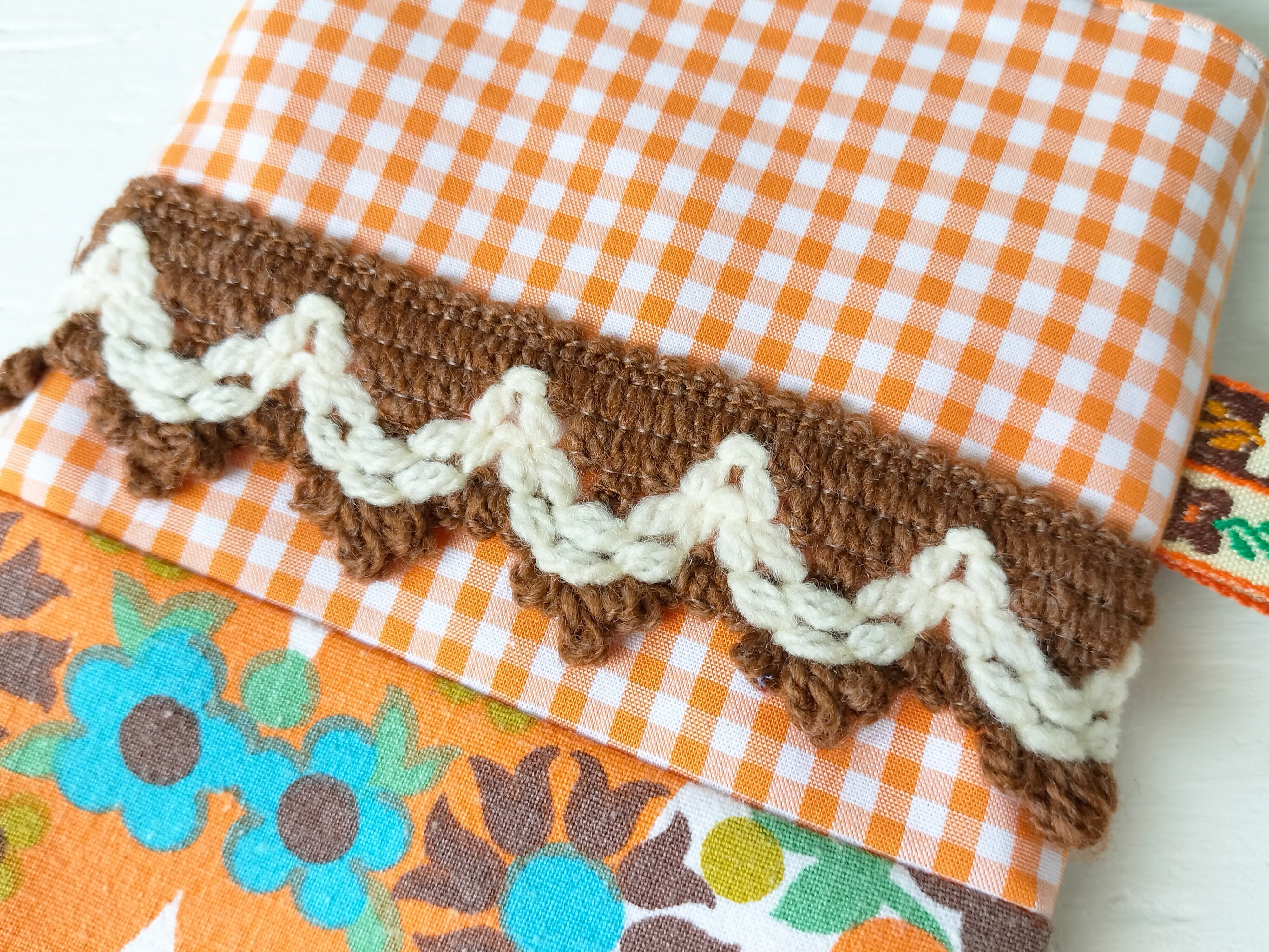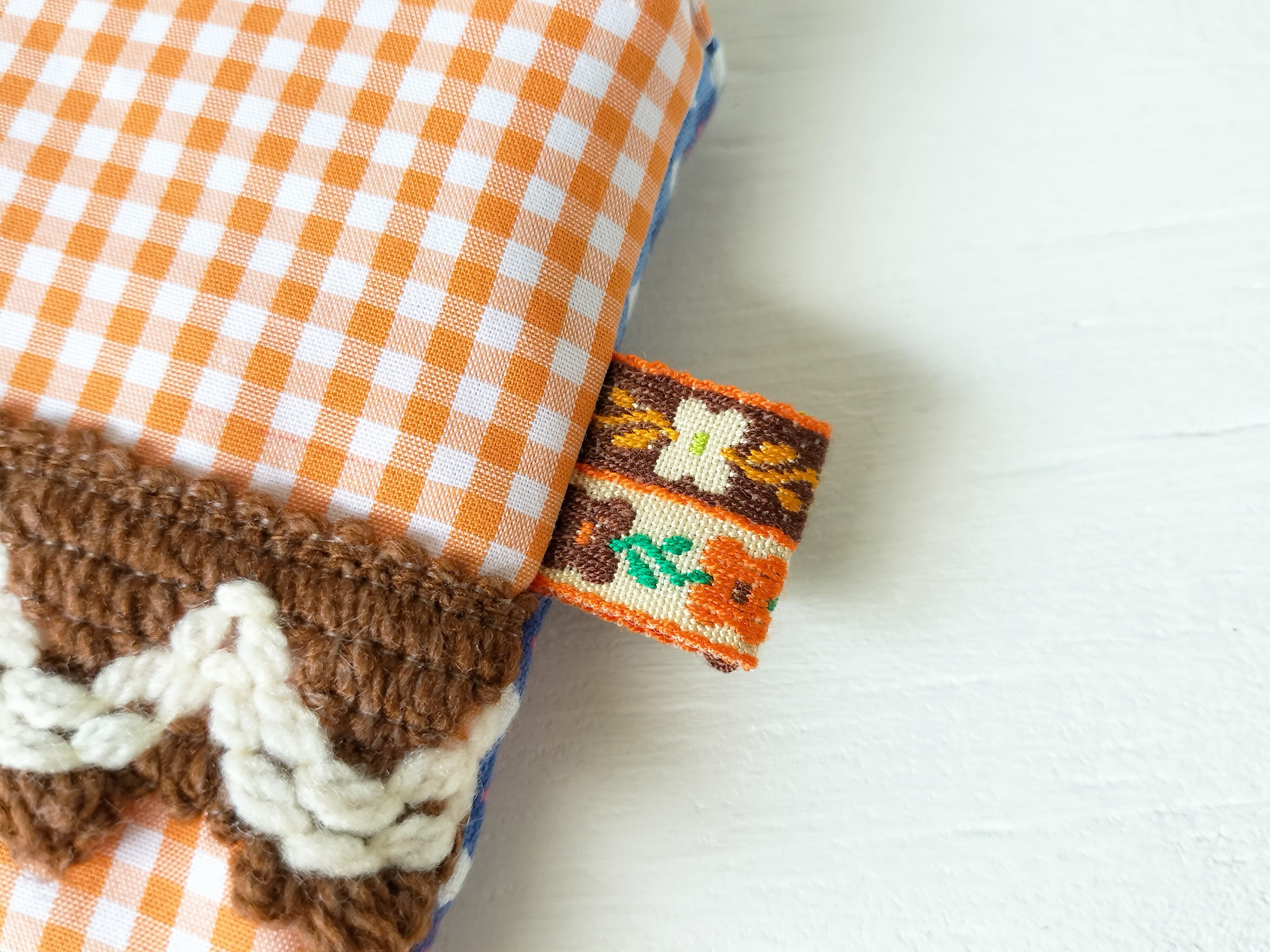 ヨーロッパのヴィンテージファブリックで色んな柄を合わせ スカラップのリボン、チロルリボンを縫い付けました。