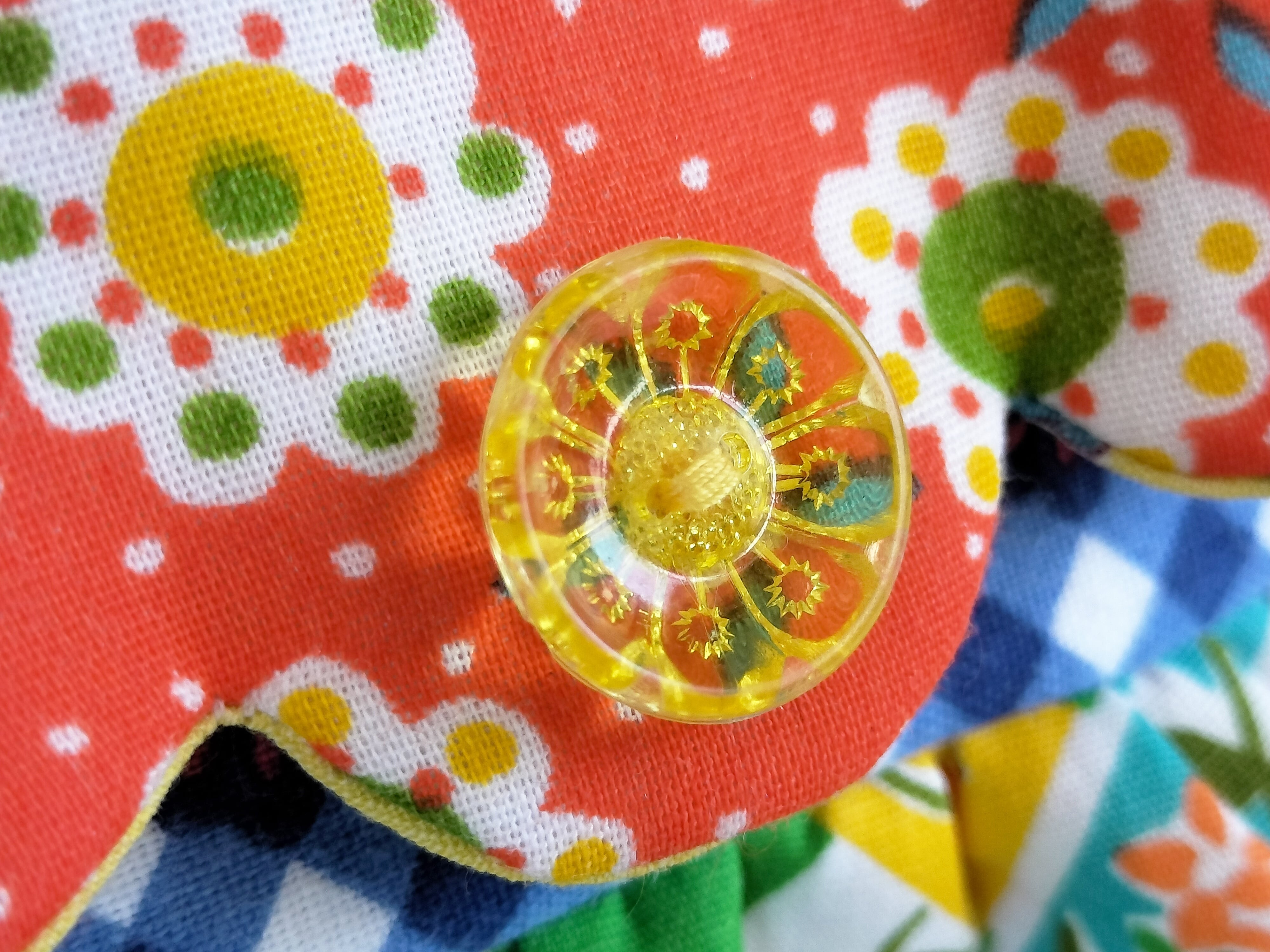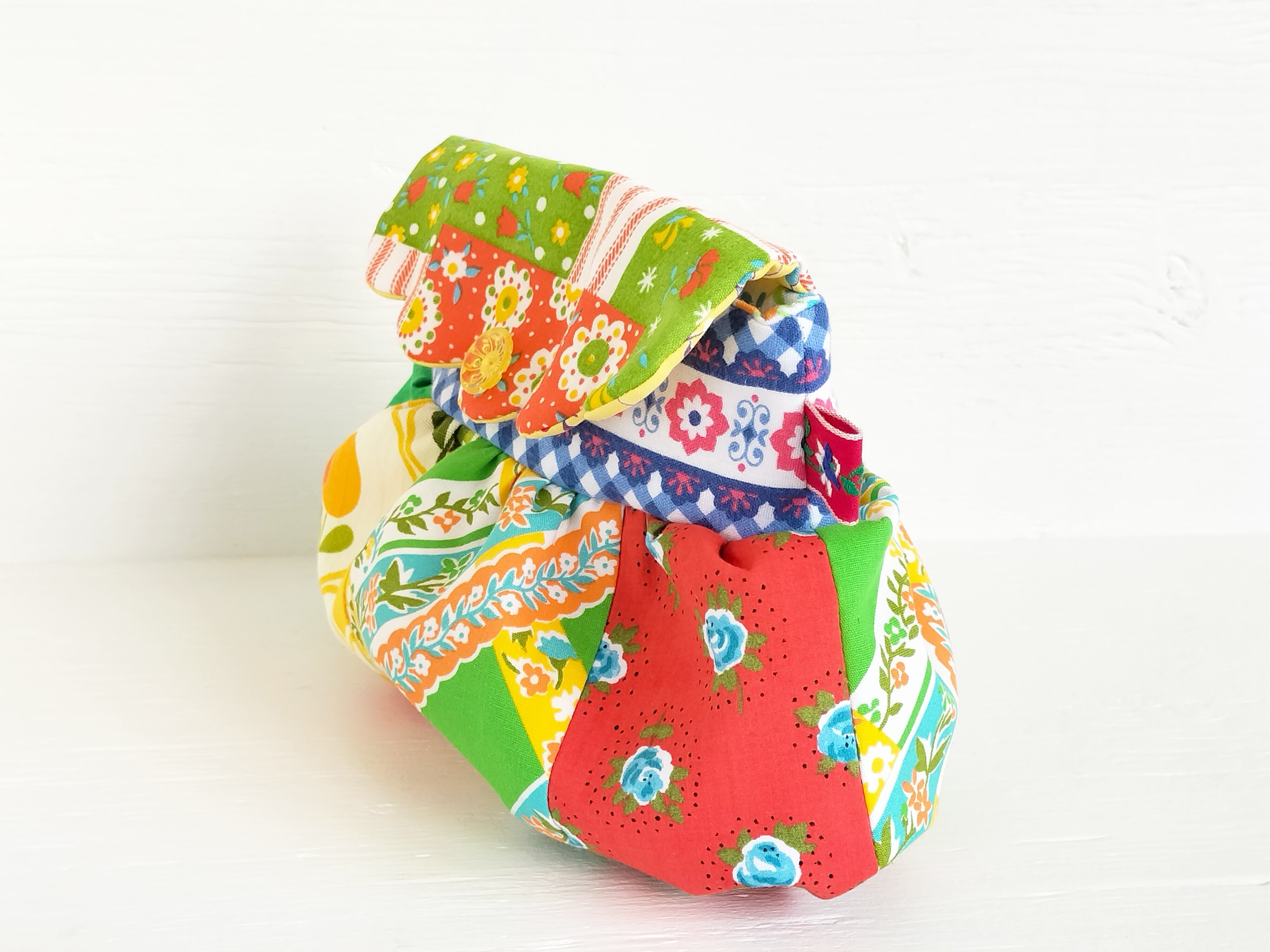 いろんな柄のヴィンテージファブリックをパッチワークした、見た目に楽しいポーチです♪