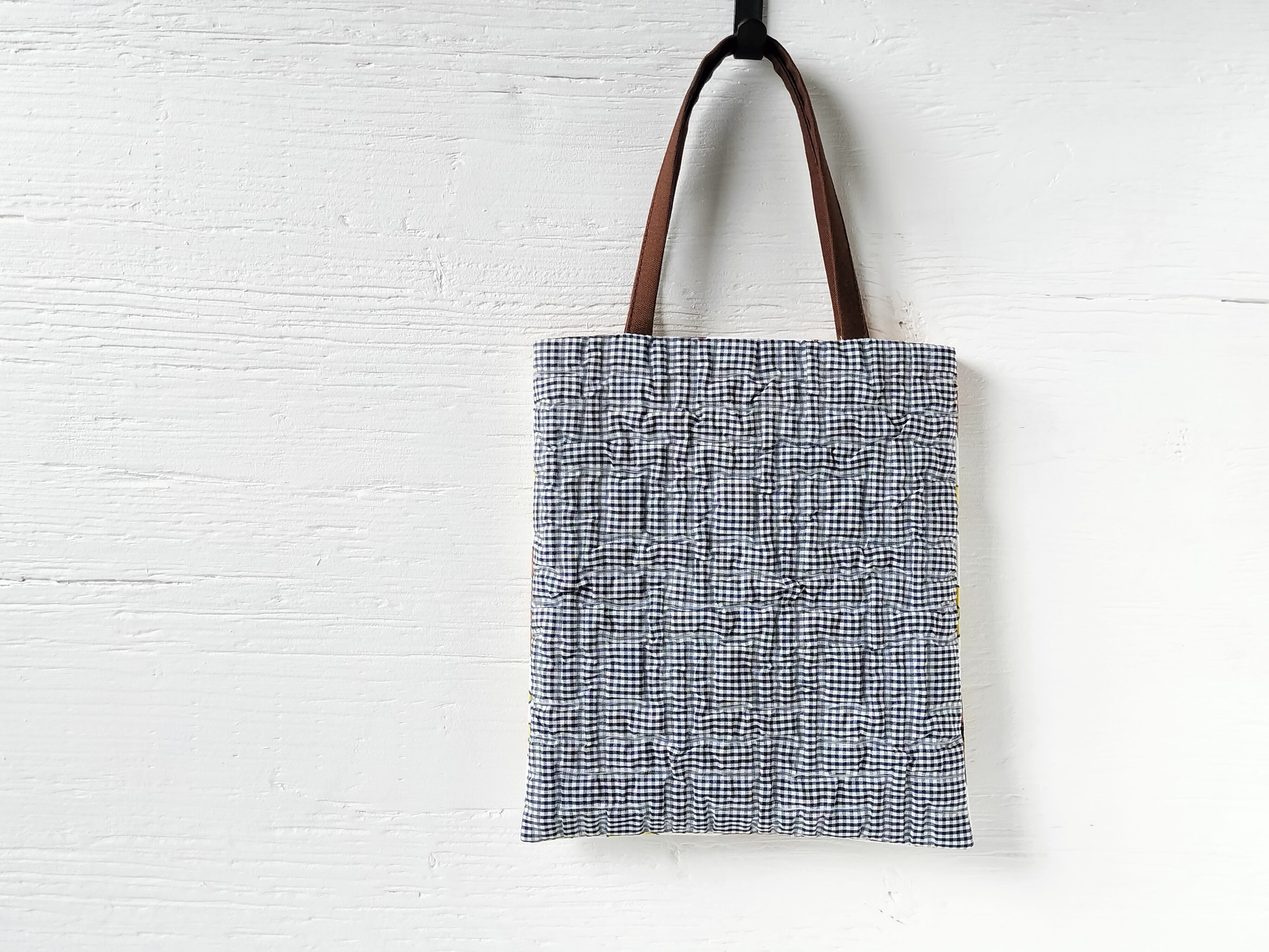 ヨーロッパのヴィンテージファブリックと、イタリアのポリエステルの変わり織ギンガムチェック生地とをあわせたバッグ。
