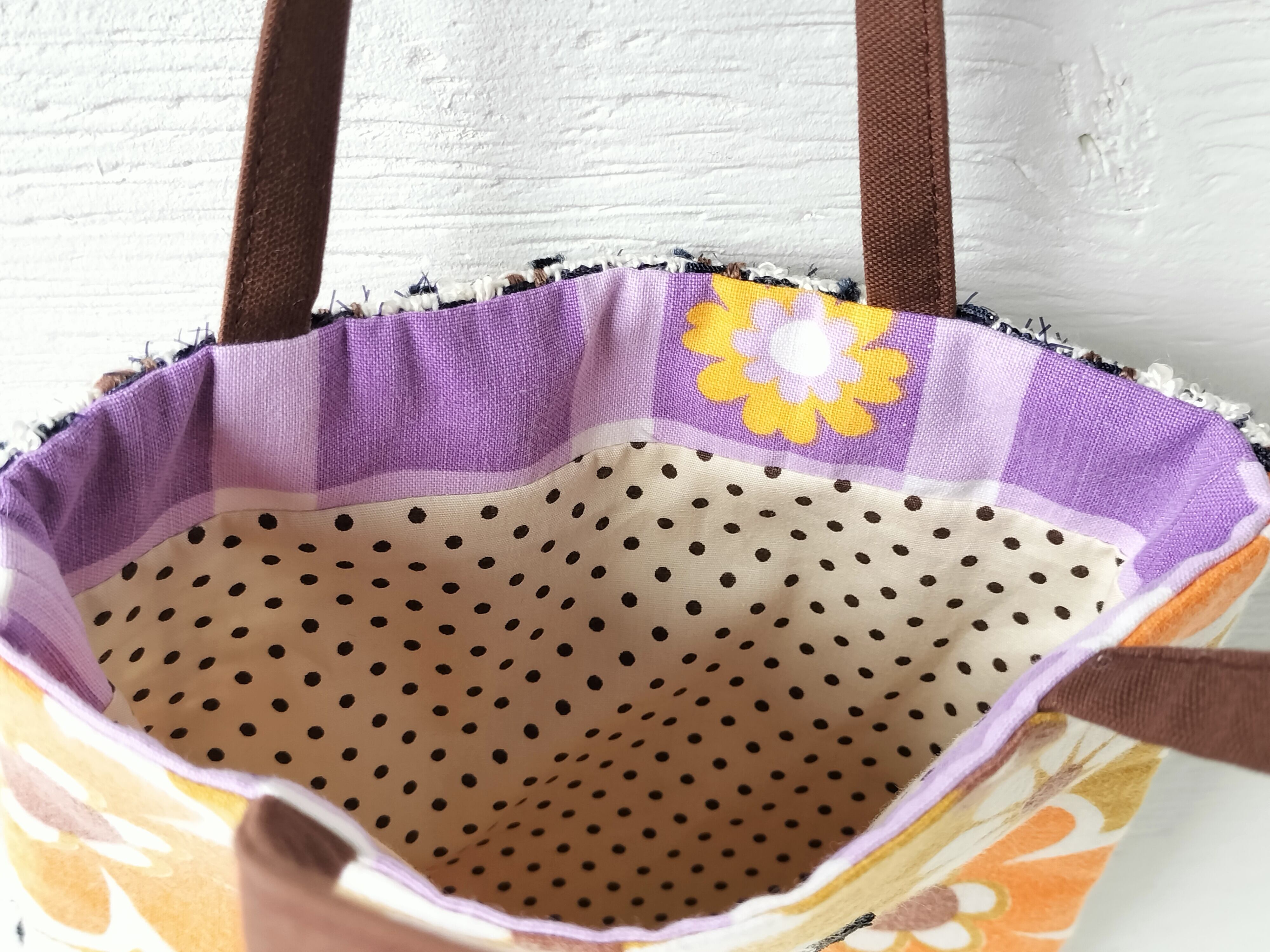 ヨーロッパのヴィンテージファブリックと、ラメ糸が入ったツイード生地とを合わせたバッグ。