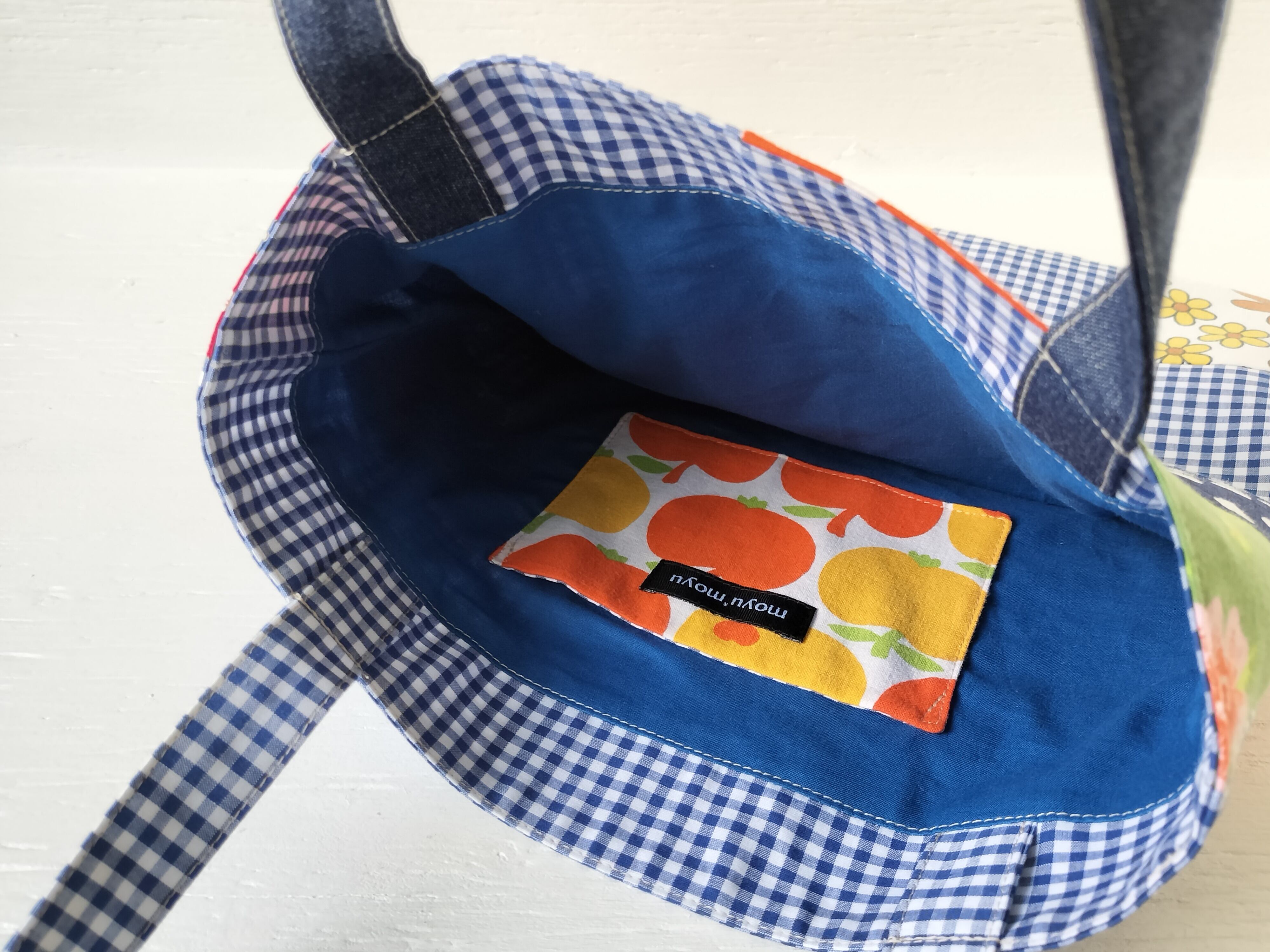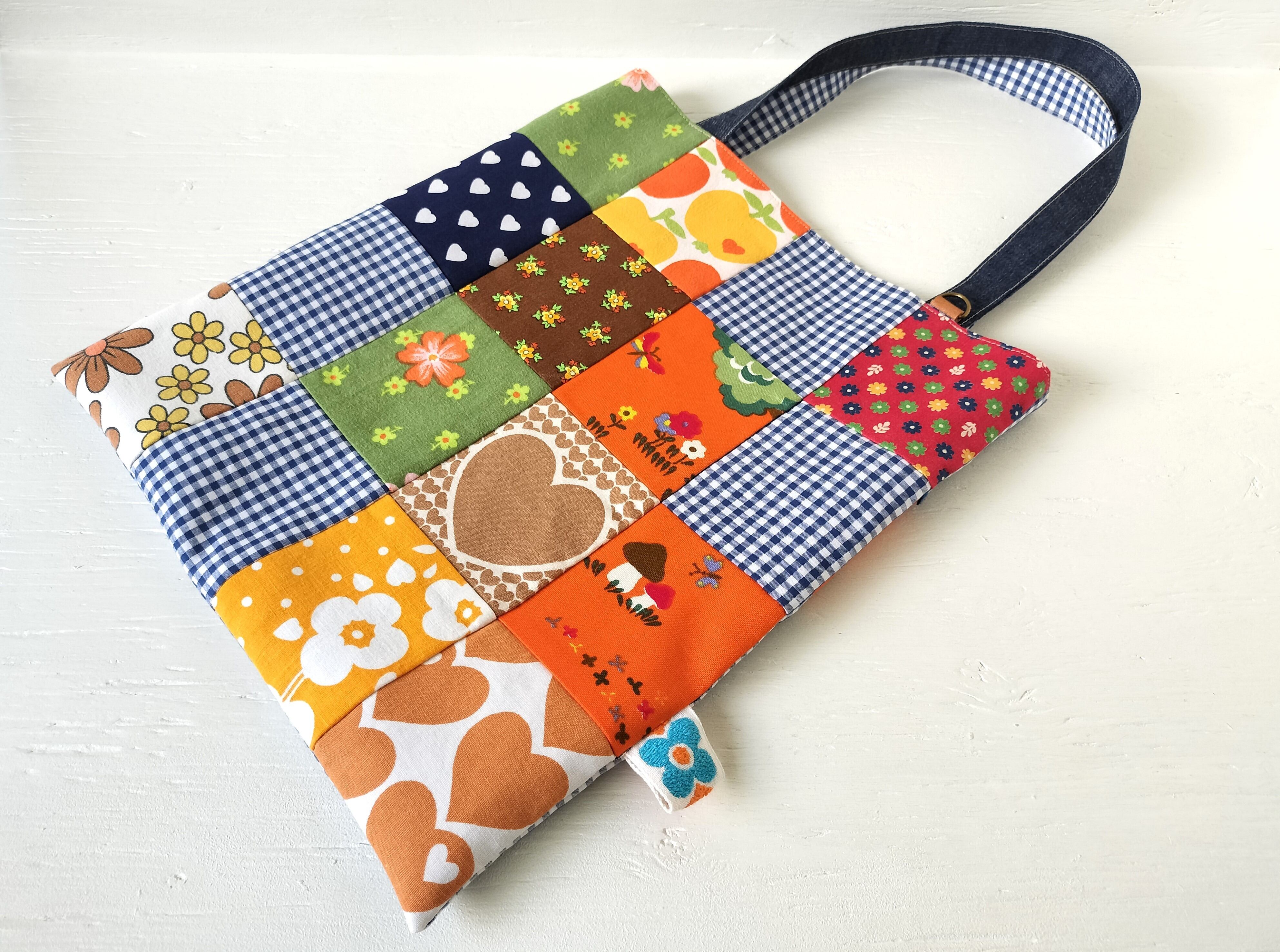 前側は色んな柄をパッチワークし、後ろ側はギンガムチェックメインでヴィンテージファブリックを隙間から覗かせました!