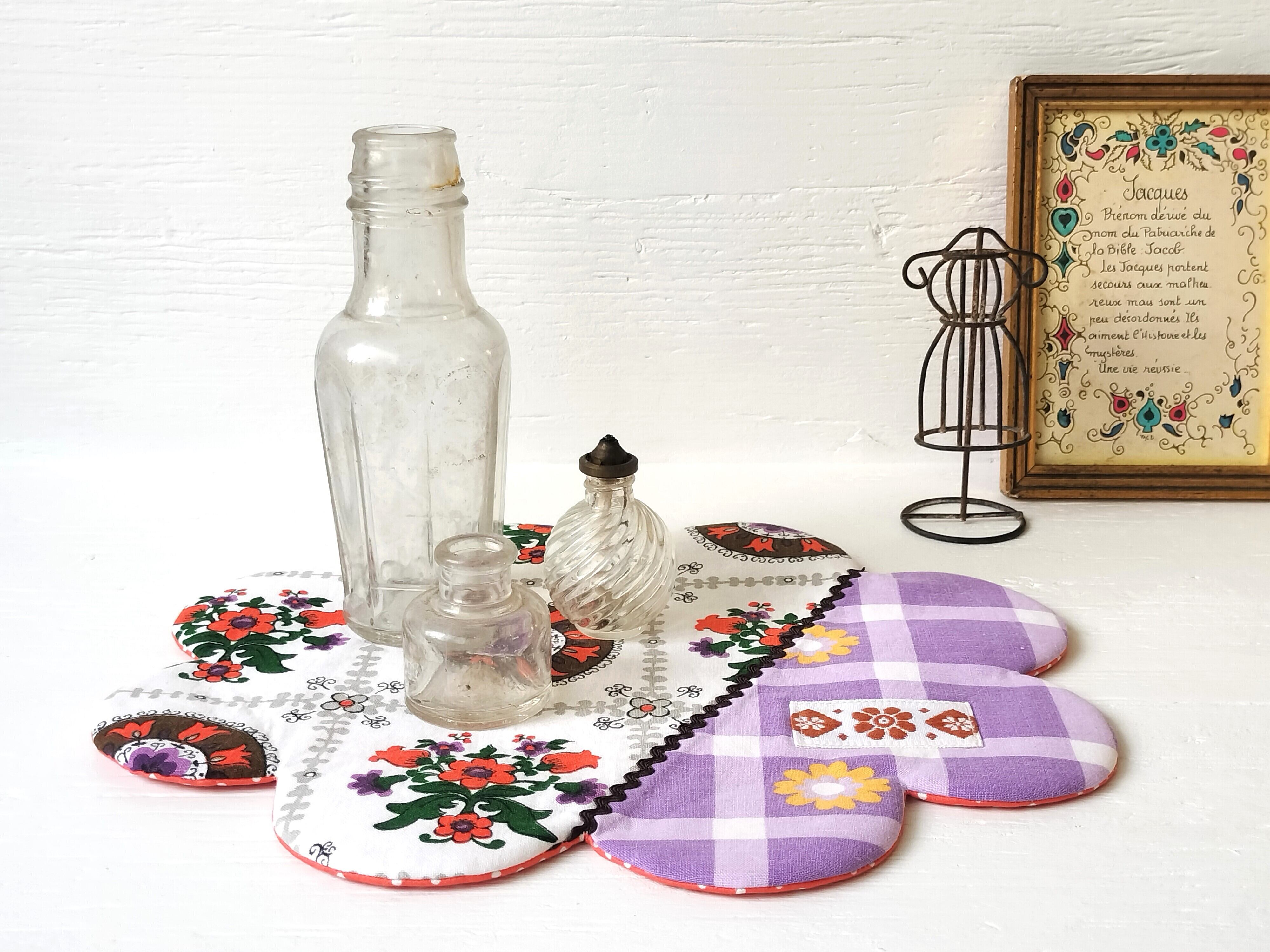 ヨーロッパのヴィンテージファブリックを使った おはなの形のマットです。